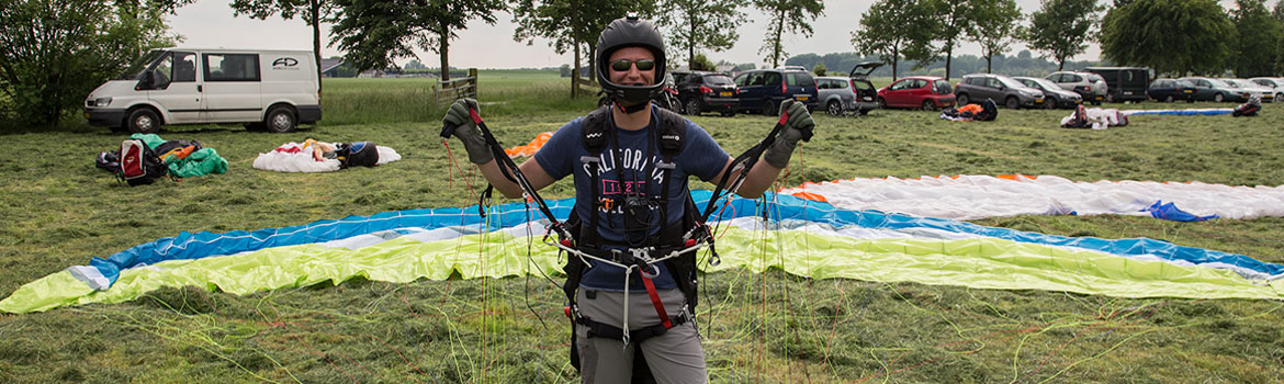 Tijdens de grondoefeningen besteden we veel aandacht aan het opzetten van het scherm (oftewel je starttechniek) en het besturen van de paraglider. Dit alles kun je zeer goed oefenen terwijl je met het scherm boven je over de grond loopt. De grondoefeningen duren 1 à 2 dagen en is het vermoeiendste gedeelte van je paragliding opleiding. Aan het einde van de eerste cursusdag maken we een afspraak voor de tweede cursusdag. Meestal is dat de zondag erop, maar als het weer het niet toelaat kan het een andere (weekend)dag worden. Je kunt je opleiding afmaken in het tempo dat jij wenst. Je mag er in totaal twee jaar over doen.